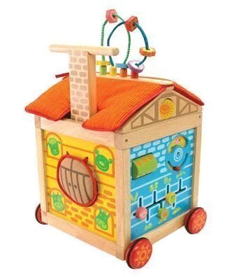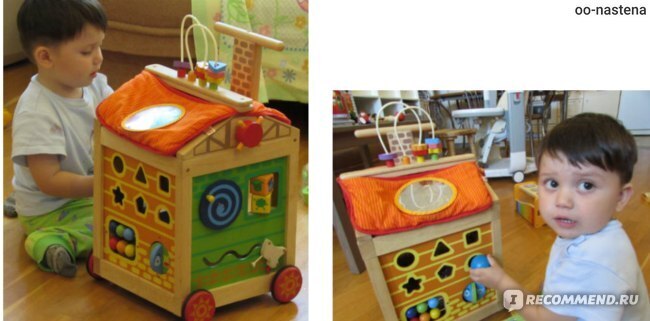 Крыша домика изготовлена из текстиля и является съемной. На самом верху находятся 2 гибкие проволоки с перемещаемыми деревянными бусинами разных цветов и форм. На скате крыши также есть безопасное зеркало диаметром 9 см.